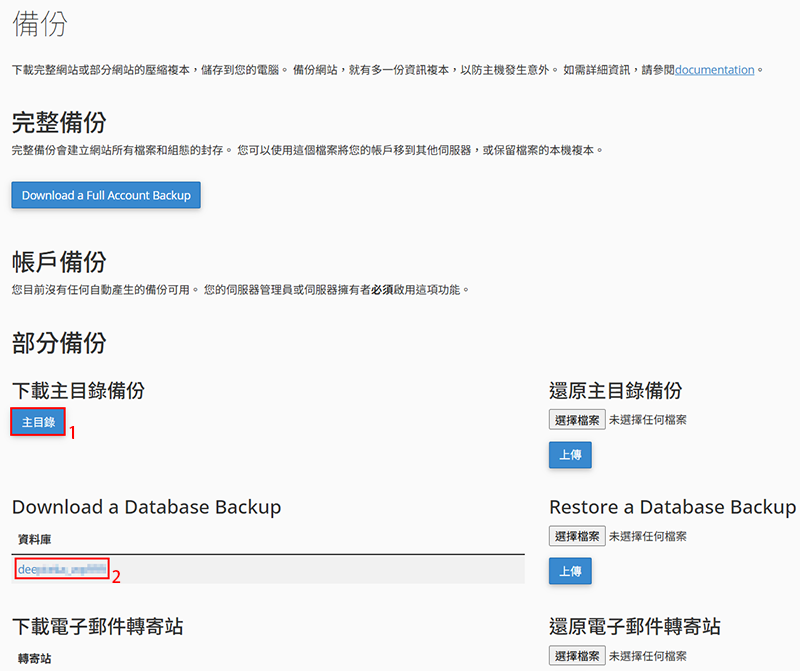 圖中的【主目錄】就是Linux的家目錄,通常你在這個主機的資料在裡面,還有【資料庫】是WordPress的依賴資源請一併下載。