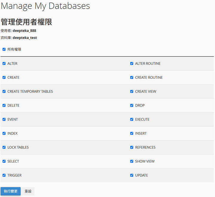 ▼圖 賦予資料庫使用者權限,勾選【所有權限】->【執行變更】