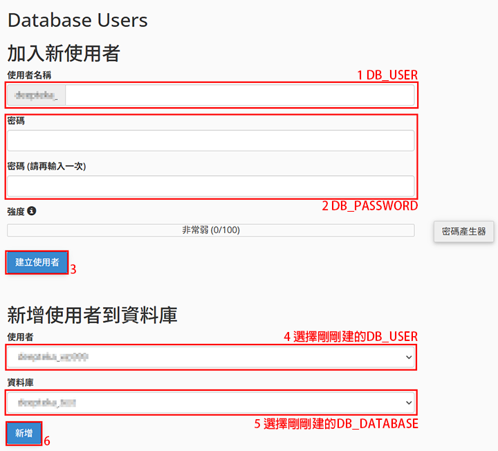 ▼圖 再來輸入剛剛記下的【使用者】'DB_USER'和【密碼】'DB_PASSWORD',並將其【新增使用者到資料庫】