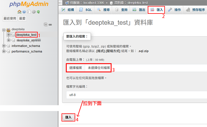 ▼圖 要匯入資料庫了, 點選【你的資料庫名稱】-> 匯入(頁籤) -> 選擇檔案 -> 匯入(按鈕)