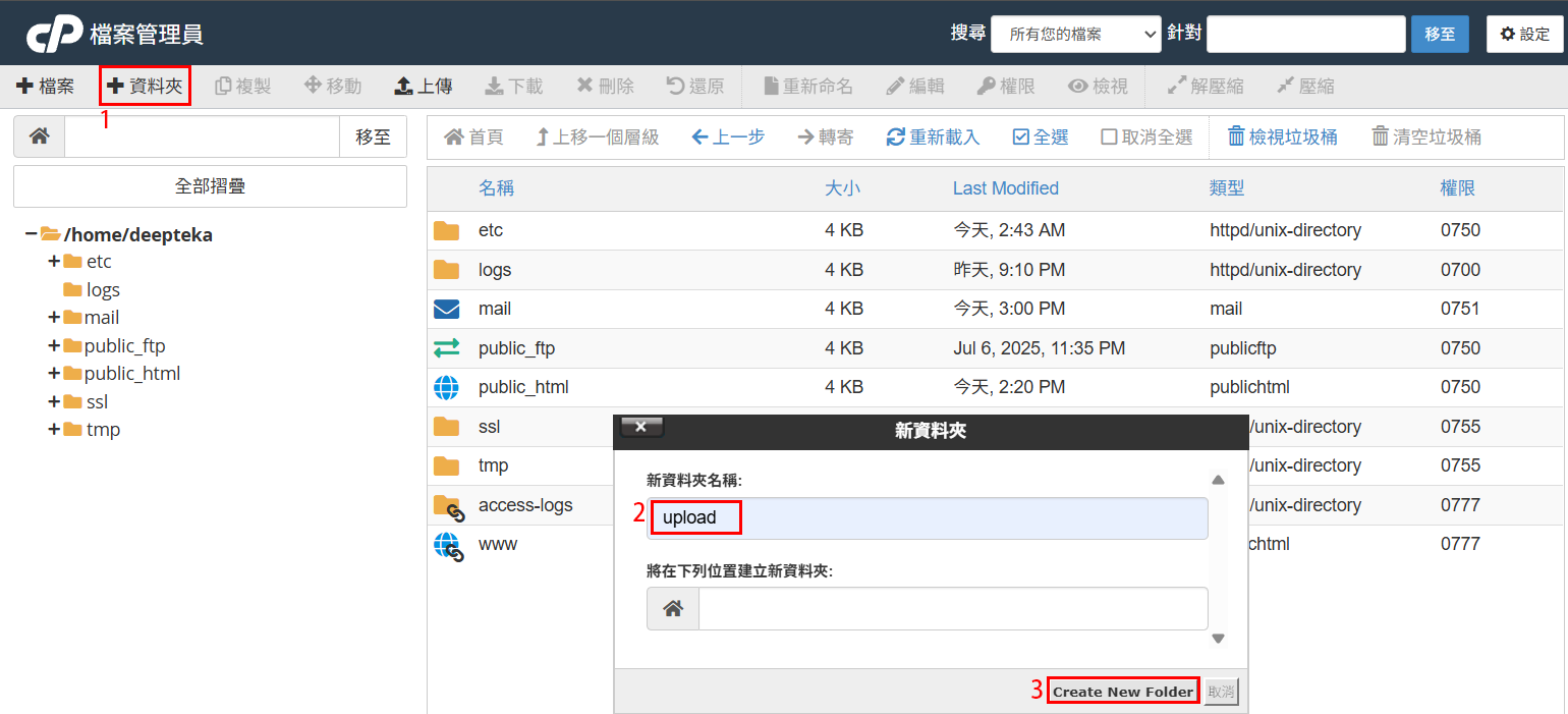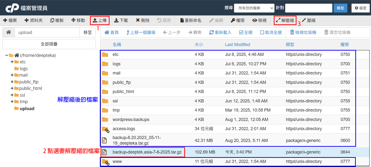 ▼圖 跟下圖操作,在剛剛建的資料夾內點選【上傳】,上傳完成後,點選該檔案,按【解壓縮】。