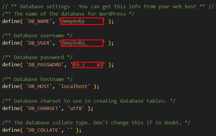 ▼圖 請記下'DB_NAME'、'DB_USER'、'DB_PASSWORD' 後面的字串