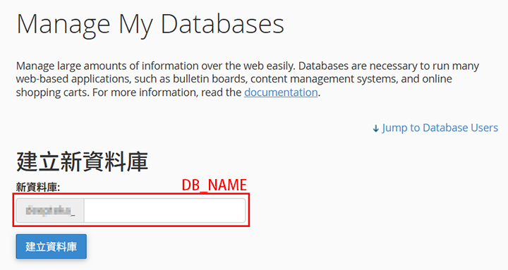 ▼圖 輸入【資料庫名稱】就是剛剛記下的'DB_NAME'
