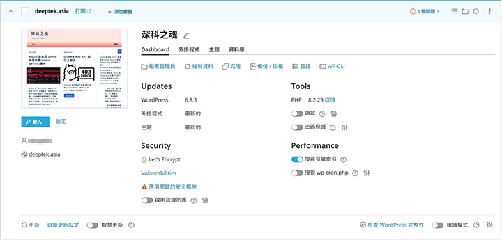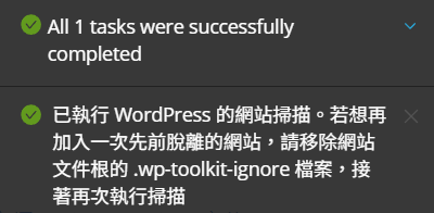 *如果出現了任何錯誤,可能要檢查【檔案】是否有缺,【資料庫】帳密是否有誤,以及【資料庫】有沒有匯入、新增使用者…等等,嘗試排除後將家目錄底下的.wp-toolkit-identifier(這是隱藏檔)刪除,再掃描一次。