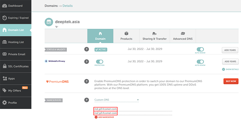回到你的網域名稱提供商,我們要自定義 DNS;找到 Name Server -> Custom DNS -> 填下上述兩組 Name Server