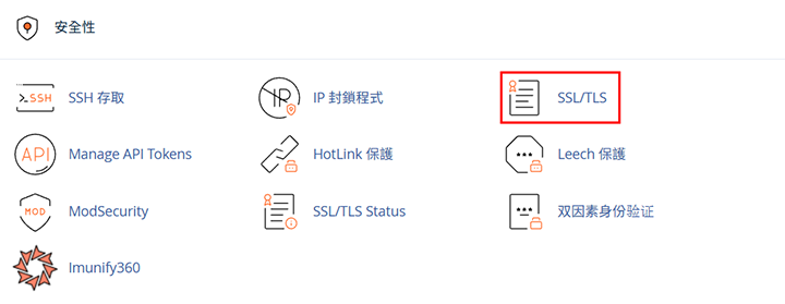 ▼圖 回到 cPanel ,找到【安全性】,點 SSL/TLS