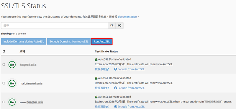 ▼圖 來到 SSL/TLS Status,點下 Run AutoSSL