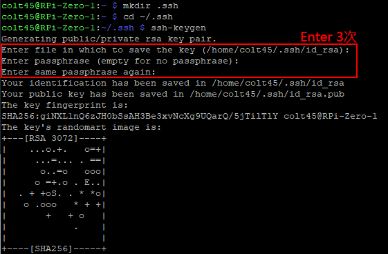 使用下面指令,先建立一個.ssh目錄再切換到.ssh,然後生成金鑰對。